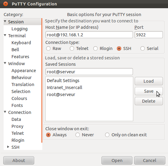 Vous pouvez maintenant vous connecter au serveur en selectionant la session Intranet puis clic "Open", un terminal s'ouvre et vous demande un mot de passe, c'est le même mot de passe que administrateur.